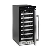 This Whynter single zone wine storage system (BWR-33SD) can hold up to 33 standard 750ml wine bottles. The powerful compressor cooling system offers optimum temperature (high 30ºF to mid 60ºF) for red, white, and sparkling wines. The front ventilation design of this unit allows for flush with cabinet undercounter installation or simply freestanding usage. The premium appeal of the BWR-33SD features an exclusive stainless steel trimmed door and a heavy stainless steel L-bar handle. The seven removable scalloped chrome racks in the unit allow for maximum storage capacity. Read more